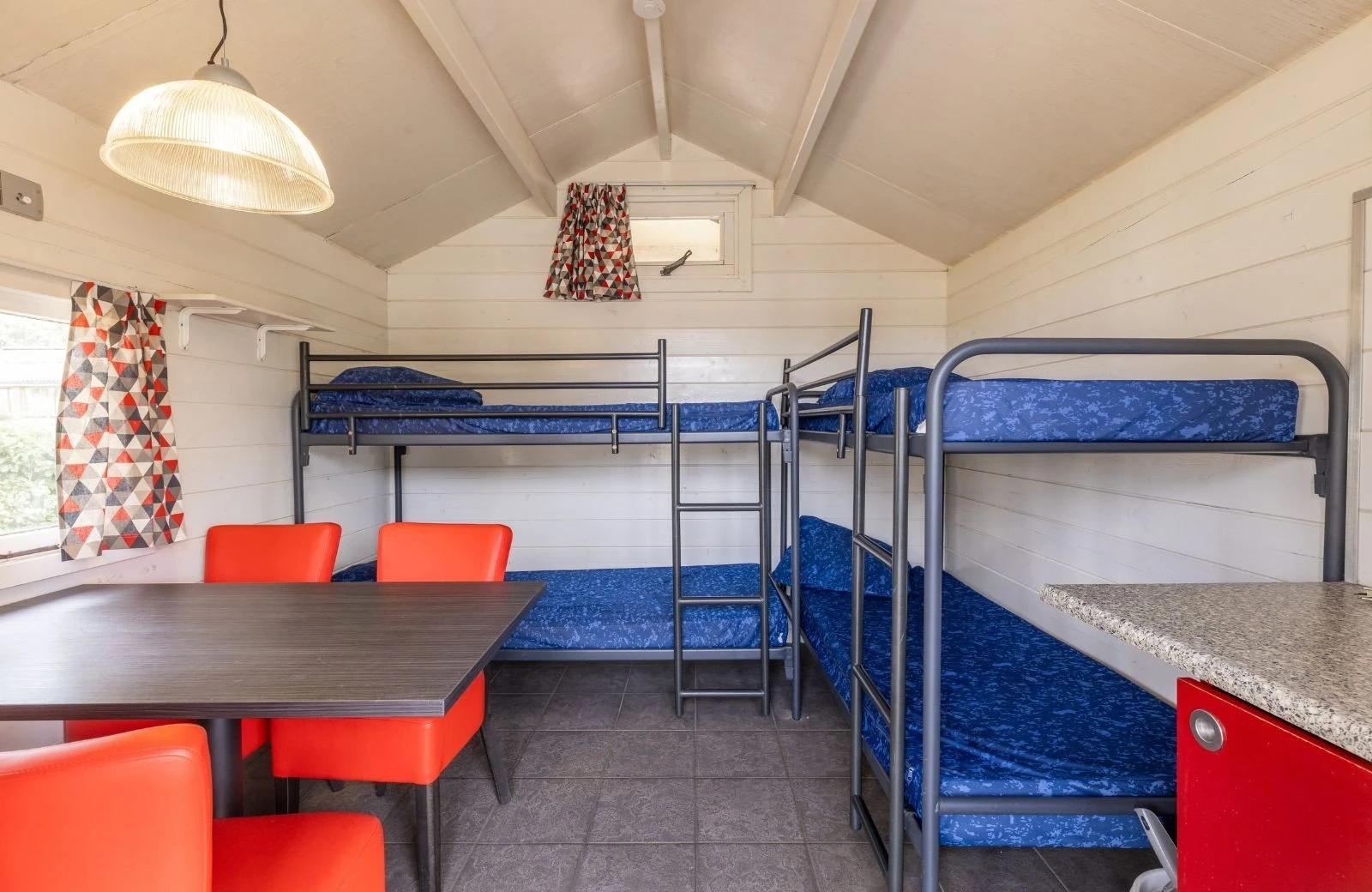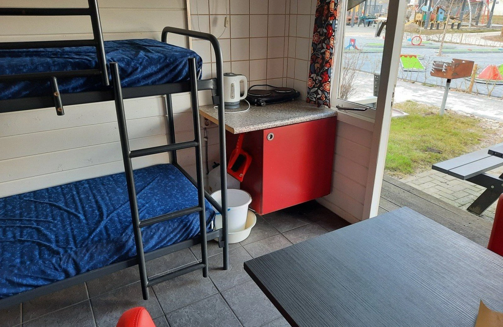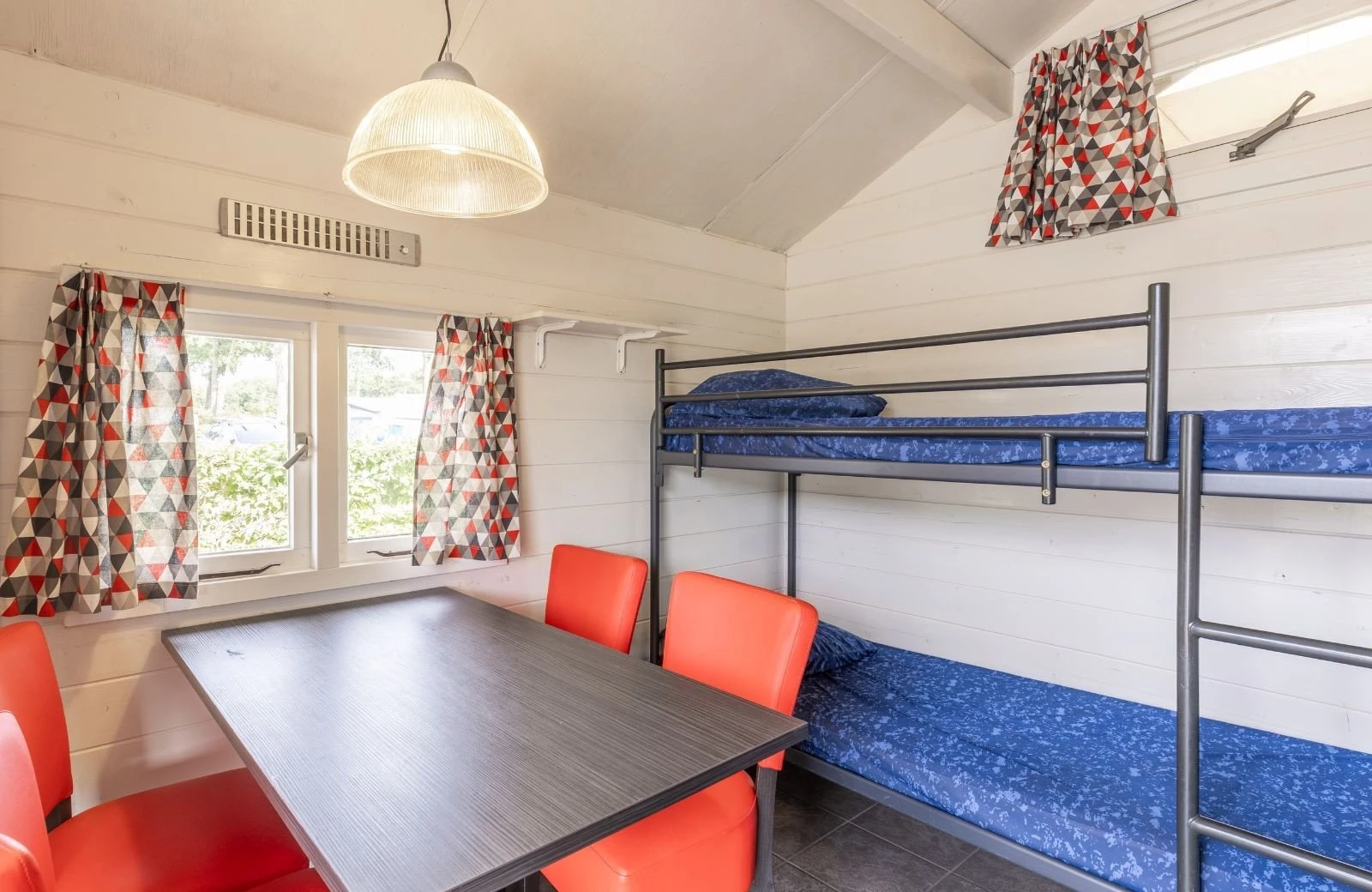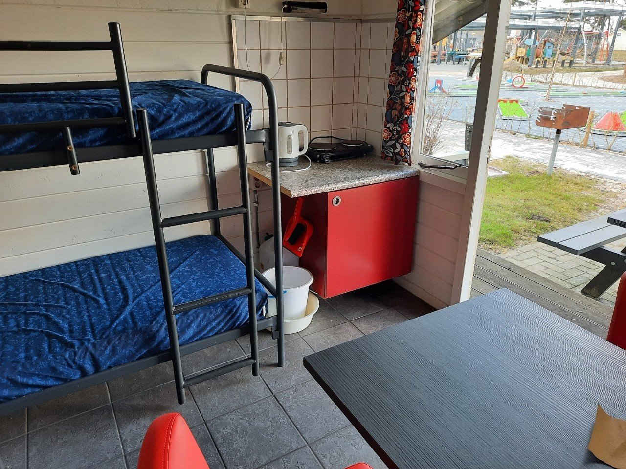 De kampeerhut is eenvoudig ingericht met twee stapelbedden, een eethoek met 4 stoelen en basisvoorzieningen zoals een kleine koelkast, twee elektrische kookplaten, een kacheltje en een waterkoker. Buiten staat een picknickbank, zodat je lekker in de buitenlucht kunt eten. Het sanitairgebouw ligt dichtbij, aangezien de hut geen eigen toilet of douche heeft.