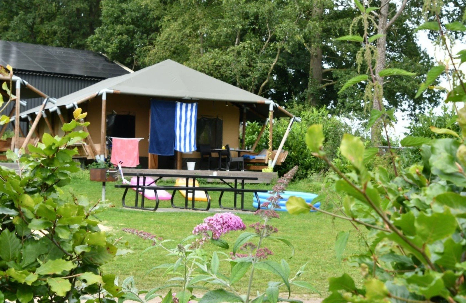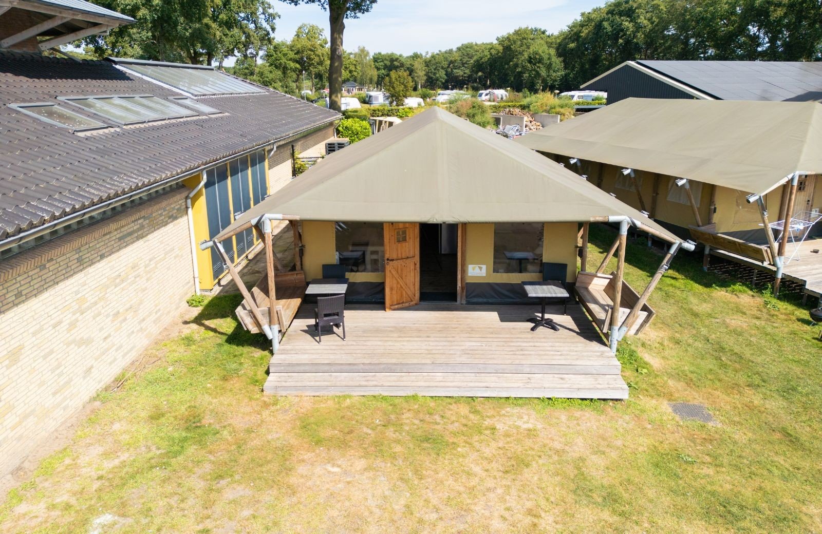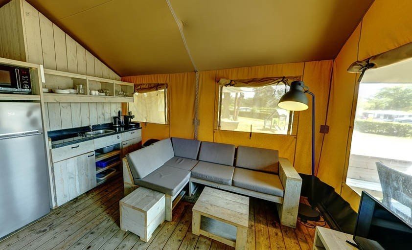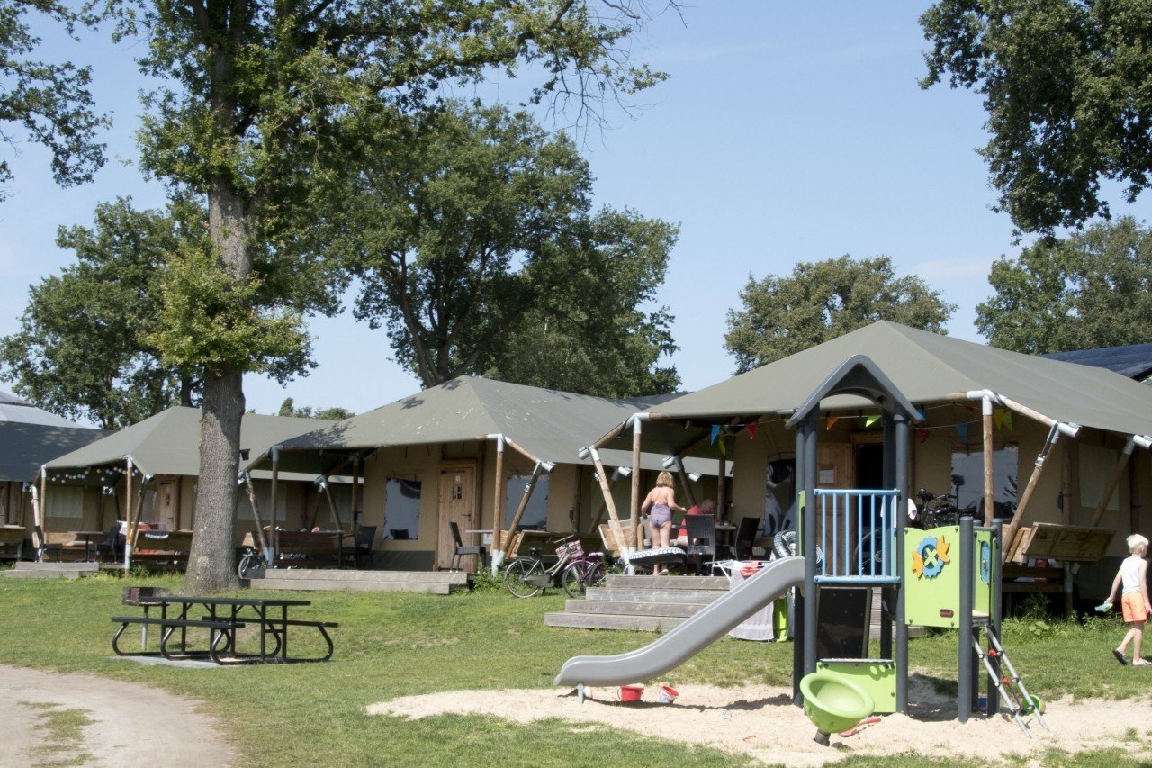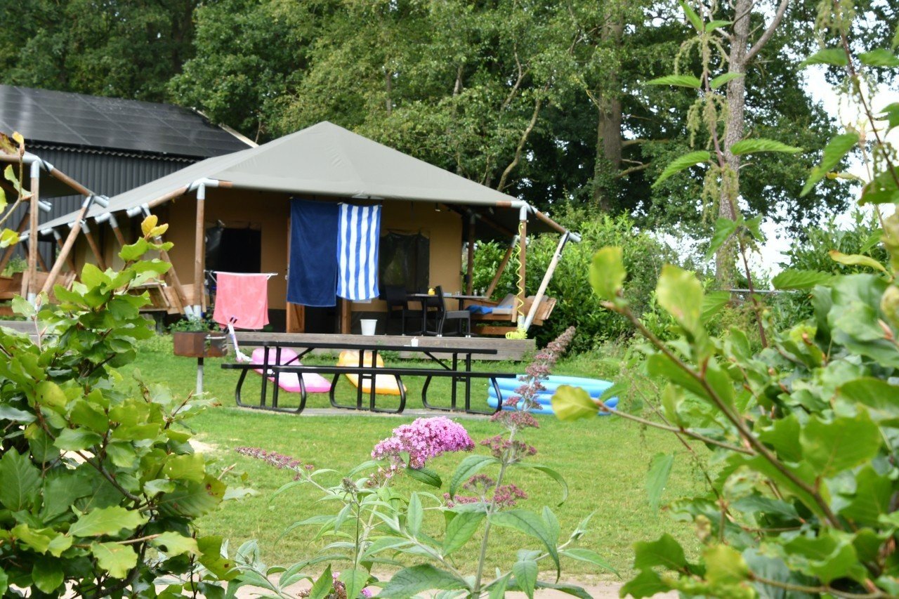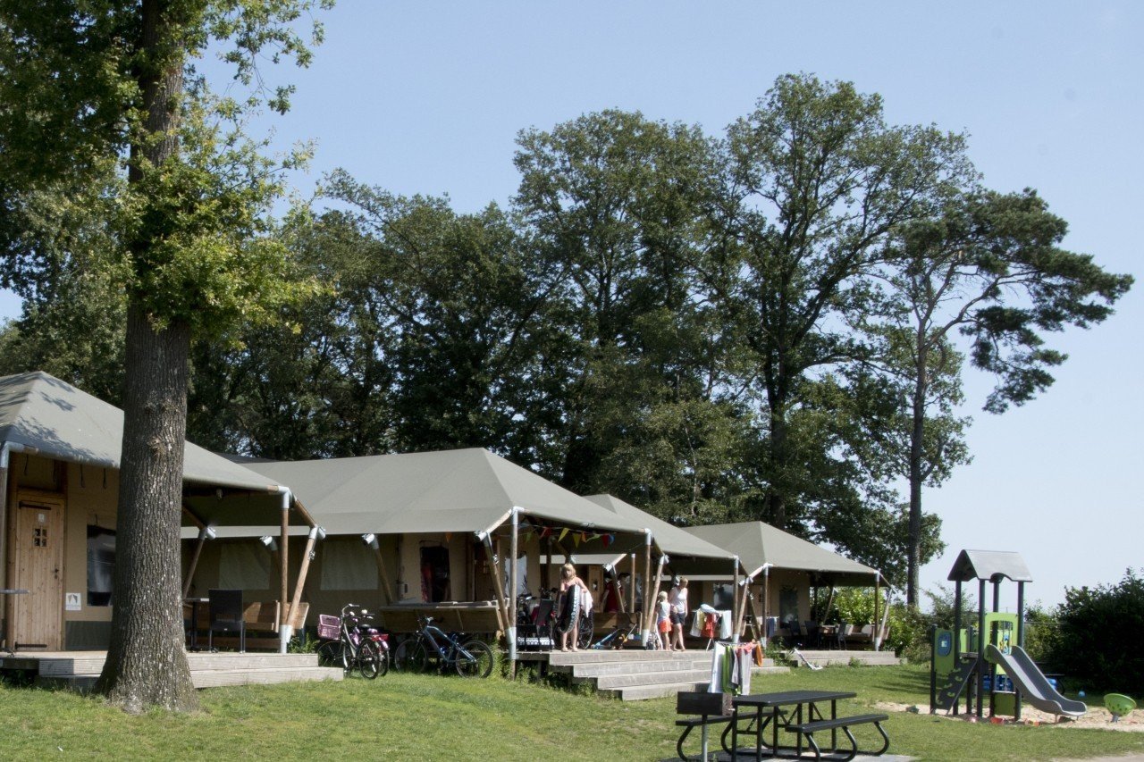 De safaritenten zijn sfeervol ingericht en voorzien van een toilet en wastafel. Er is geen douche, maar het toiletgebouw is dichtbij. De tenten staan centraal op de camping, dicht bij het zwembad en de speeltuin. Je kunt je auto vlakbij parkeren en huisdieren zijn welkom.